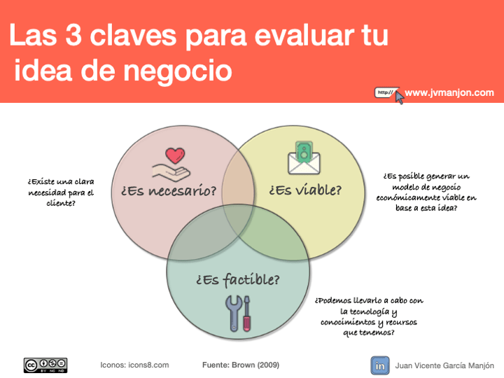 La generación de ideas es el primer paso para poner en marcha un negocio innovador. Ahora bien, una vez que tenemos nuestra idea ¿qué pasos tengo que dar para evaluar o testar que esa idea sea la base de un modelo de negocio ganador? Tim Brown (IDEO) en su libro Change by Design nos habla de tres conceptos Desirability (Deseable – Necesaria) – Feasibility (Factible – Realizable) — Viability (Viable).