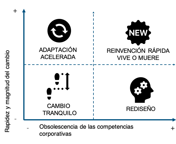 Obsolescencia de las competencias corporativas. Es decir, hasta qué punto las capacidades de la organización han quedado obsoletas debido a los cambios. La pregunta es ¿me sirve la forma en la que sé y soy bueno haciendo las cosas para la nueva situación? ¿Qué necesito aprender para operar con éxito en la nueva situación?