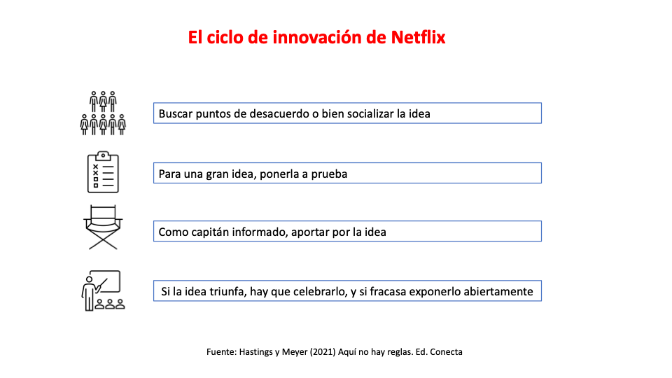 Reed Hastings, CEO de Netflix, habla en su libro “Aquí no hay reglas: Netflix y la cultura de la reinvención” del ciclo de innovación de la compañía. Hastings hace referencia a lo que él considera el mayor fracaso en la historia de Netflix, a saber, “Qwikster”. Netflix ofrecía un servicio en el que combinaba DVD por correo y video en streaming, todo ello por 10 dólares. Hastings tuvo la idea de crear una nueva empresa dedicada al mercado del DVD, Qwikster, y ofrecer dos suscripciones para que los clientes eligiesen, pagando un precio de 8 dólares por servicio. Cuando la iniciativa fracasó, Hastings se dio cuenta de que nadie había sido capaz de dar su opinión y avisar de lo que se avecinaba, a pesar de que muchos colaboradores tenían una clara opción en contra.