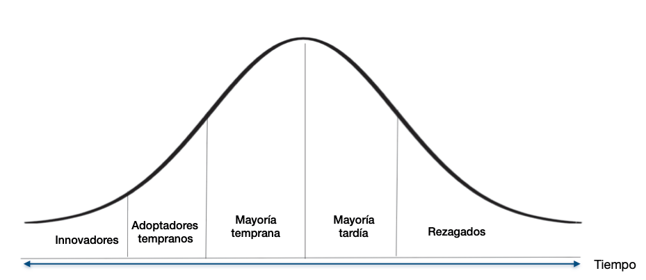 La curva de difusión puede entenderse como una función que explica el número de usuarios potenciales que adoptarán una innovación con el tiempo. El porcentaje de adopción sobre el tiempo es una función incremental que al principio puede mostrar una forma convexa, pero con el tiempo describe una forma cóncava, dibujando una curva en forma de campana [Rogers, 1962]. A continuación se muestra la conocida como curva de adopción de la innovaciones en la que se diferencian los distintos grupos homogéneos en cuanto a su comportamiento frente a la innovación.