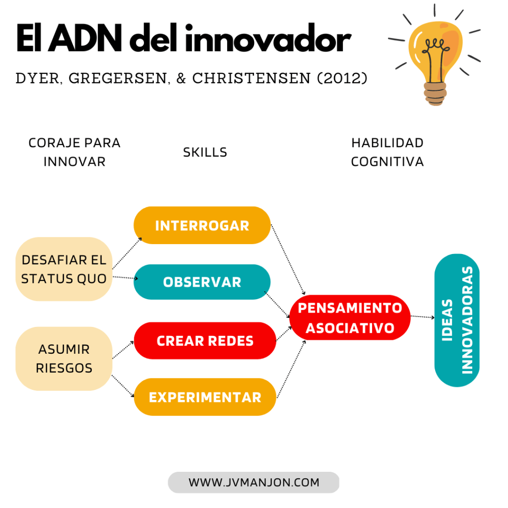 Los autores estudiaron cuáles eran los –skills- que tenían los líderes innovadores y descubrieron que estos compartían una serie de habilidades como las de interrogar adecuadamente, eran capaces de observar, generaban redes y ponían en marcha procesos de experimentación, lo que les llevaba a un pensamiento asociativo capaz de generar ideas innovadoras.