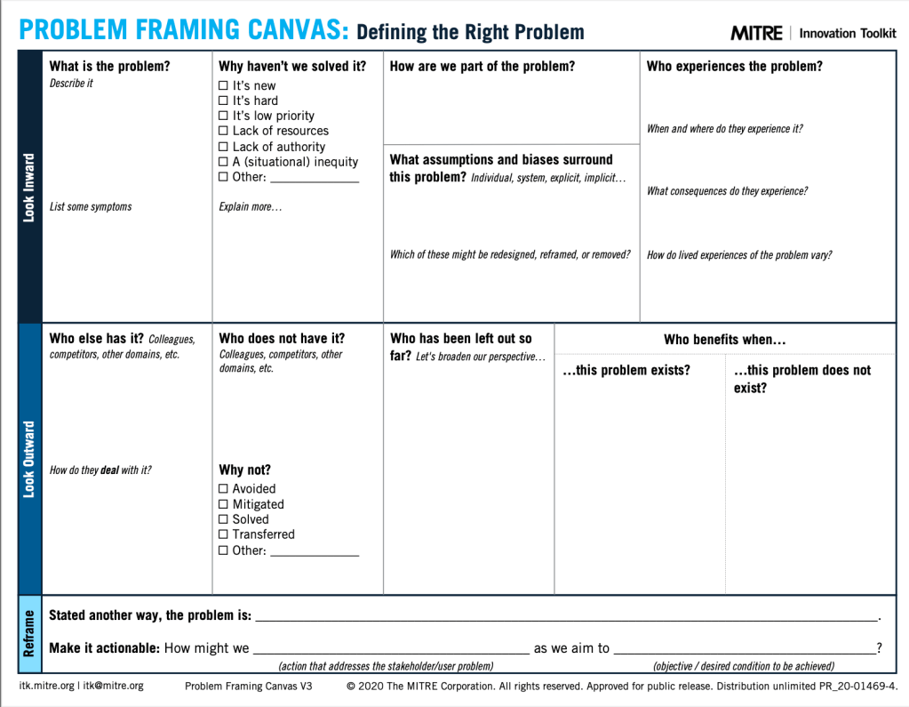 Una herramientas que podemos utilizar para analizar adecuadamente el problema es el Problem Framing Canvas de MITRE Innovation Toolkit. Como puedes ver, presenta una estructura donde nos ofrece un marco de análisis interno y externo del problema. Puedes descargar la herramienta aquí y conocer la dinámica para su aplicación.
