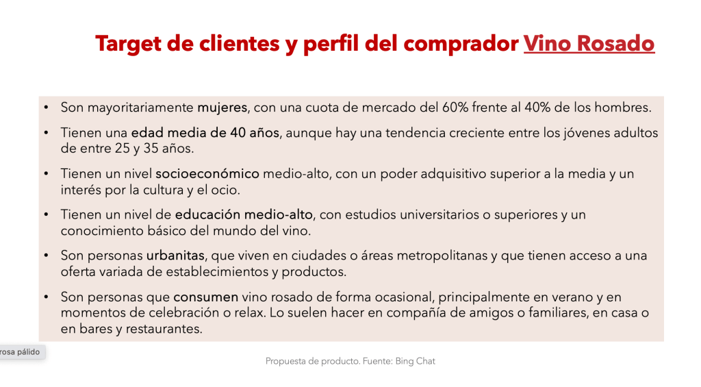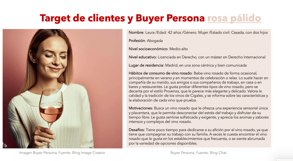 Target de clientes y perfil del comprador: Se describieron las características, motivaciones y desafíos de cada segmento, y se crearon dos buyer personas, uno para cada segmento, con datos sobre cómo sería el cliente tipo para cada producto. A continuación puedes ver la información sobre los productos propuestos por el análisis con IA y los buyer persona. Verás que las imágenes están hechas aun con DALL-E2 y hay diferencias importantes con la versión actual que puedes utilizar en Bing Image Creator con la versión 3. Obtuvimos como resultado dos tipos de producto para el vino rosado: el rosa pálido y el rosa fresa.