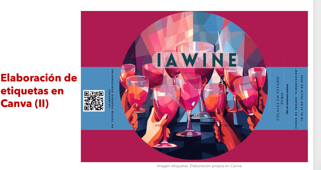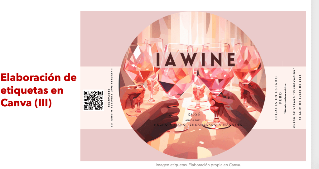 Pero no terminamos aquí, el reto era embotellas el vino para presentarlo y realizar una cata en el curso VINNOVACIÓN organizado por la Fundación de la Universidad Europea Miguel de Cervantes. Para ello, necesitábamos diseñar la etiqueta y el branding del vino rosado (fresa y rosa pálido),y además hacerlo en función de la fotografía ganadora del concurso de fotografía del curso Innovación. Así que hemos utilizado el generador de imágenes Blue Willow, Bing image creator y Stable Diffusion con los que hemos diseñado diferentes opciones creativas a partir de la fotografía base. También se ha utilizado el editor de imágenes Canva, que ha permitido personalizar el nombre, el logotipo y el color del vino. Además, se ha utilizado el buscador de imágenes Bing Image Creator, que ha ofrecido inspiración sobre otros diseños de etiquetas y botellas de vino rosado.