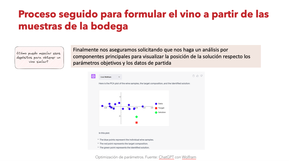 Ahora es el momento de pasar a la acción y elaborar ambas variedades. Para elaborar la receta del vino rosado (rosa pálido y fresa), se ha utilizado ChatGPT, que ha interactuado con los enólogos y nuestros expertos en innovación para sugerir las proporciones óptimas de las diferentes variedades de uva, los parámetros fisicoquímicos y el proceso de vinificación. También se ha utilizado el plugin Wolfram para realizar cálculos y gráficos sobre el análisis sensorial del vino (en estos momentos ChatGPT4 ya tiene integradas estas funciones). A continuación, puedes ver el esquema que hemos utilizado: