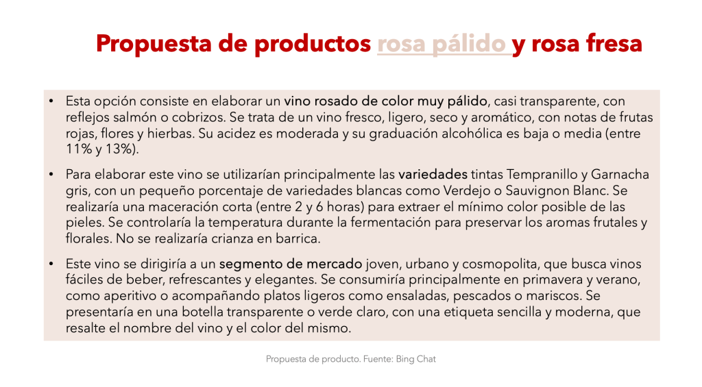 En este punto, la investigación de consumidores, tendencias y mercado, más toda la información de contexto nos ha llevado a definir dos tipos de productos, un vino rosa fresa y otro vino rosa pálido, los cuales como puedes ver en la información anterior, están definidos en cuanto a las características de producto que son preferidas en cuanto a consumo.