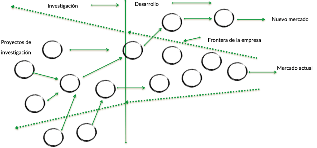 A continuación, podemos ver un esquema de innovación abierta en el que las fases de investigación y desarrollo tecnológico se relacionan con entidades y conocimiento del exteriores la vez que también generan flujos de conocimiento desde dentro de la empresa hacia el entorno.