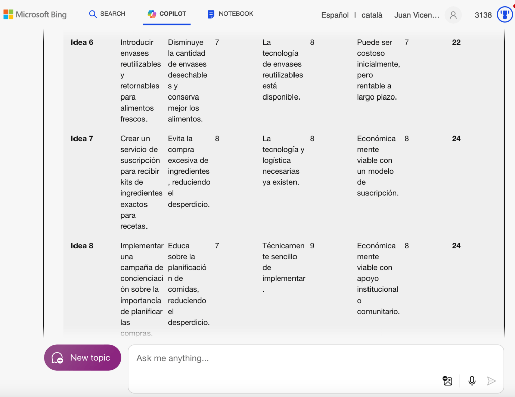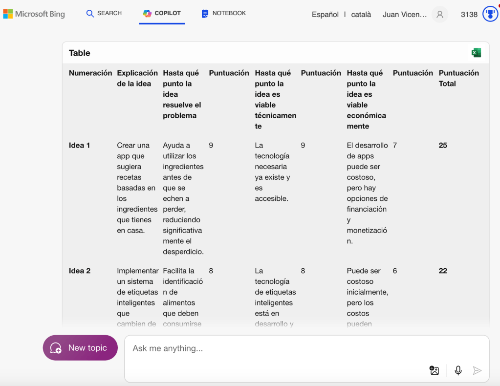 Mira los resultados que hemos obtenido con Copilot en la evaluación de las ideas que antes ha generado: