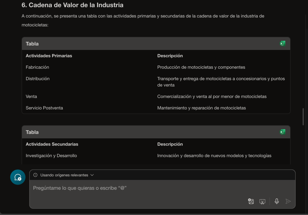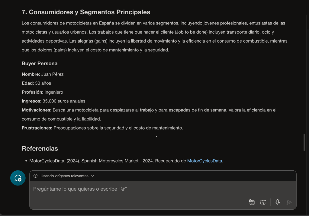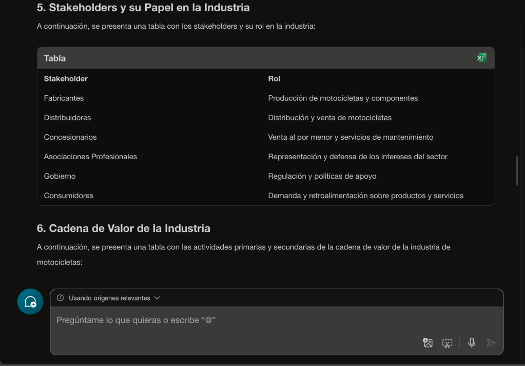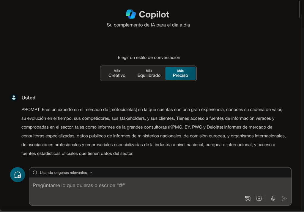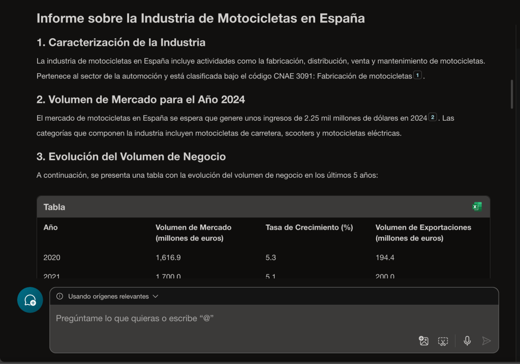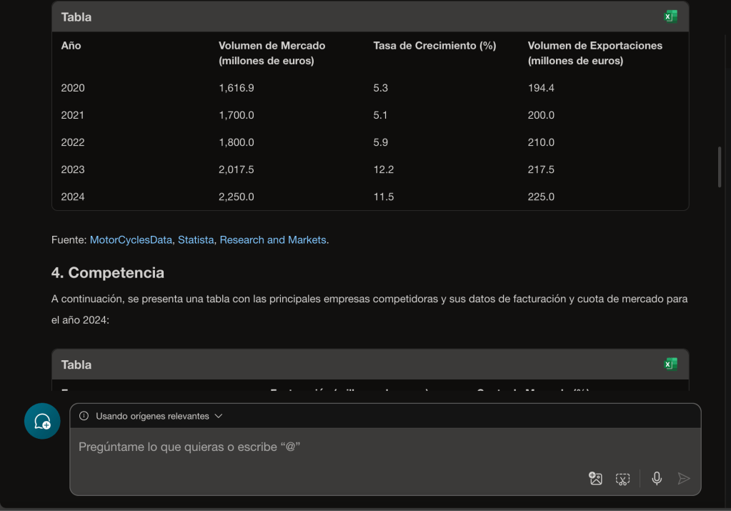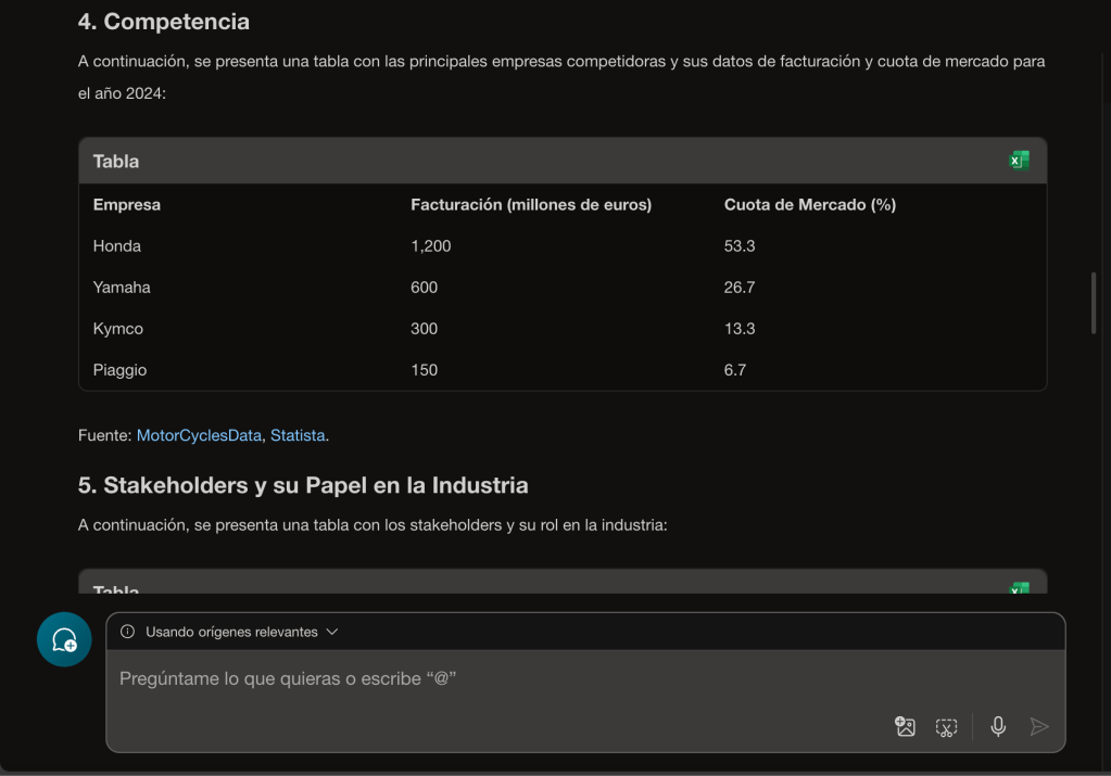 Como siempre, hemos hecho una prueba con el prompt, en este caso para la industria de motocicletas en España. Te comparto los resultados que hemos obtenido con distintas IAs. En primer lugar, veamos qué tal lo ha hecho Copilot: