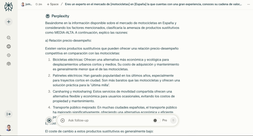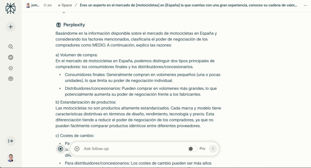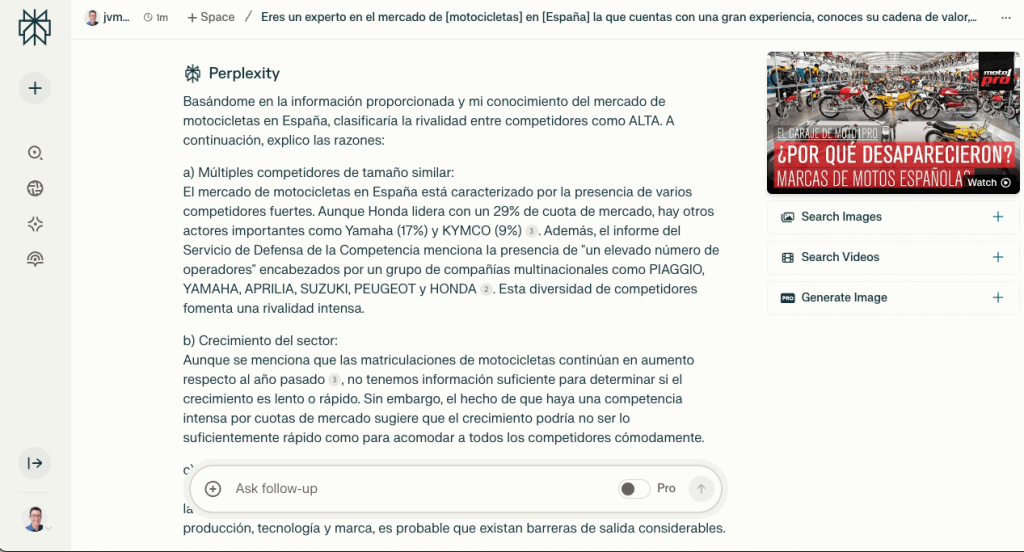 Te dejo los resultados que hemos obtenido con Perplexity (búsqueda normal) para el mercado de motocicletas en España. Puedes ver los resultados de cada uno de los prompts: