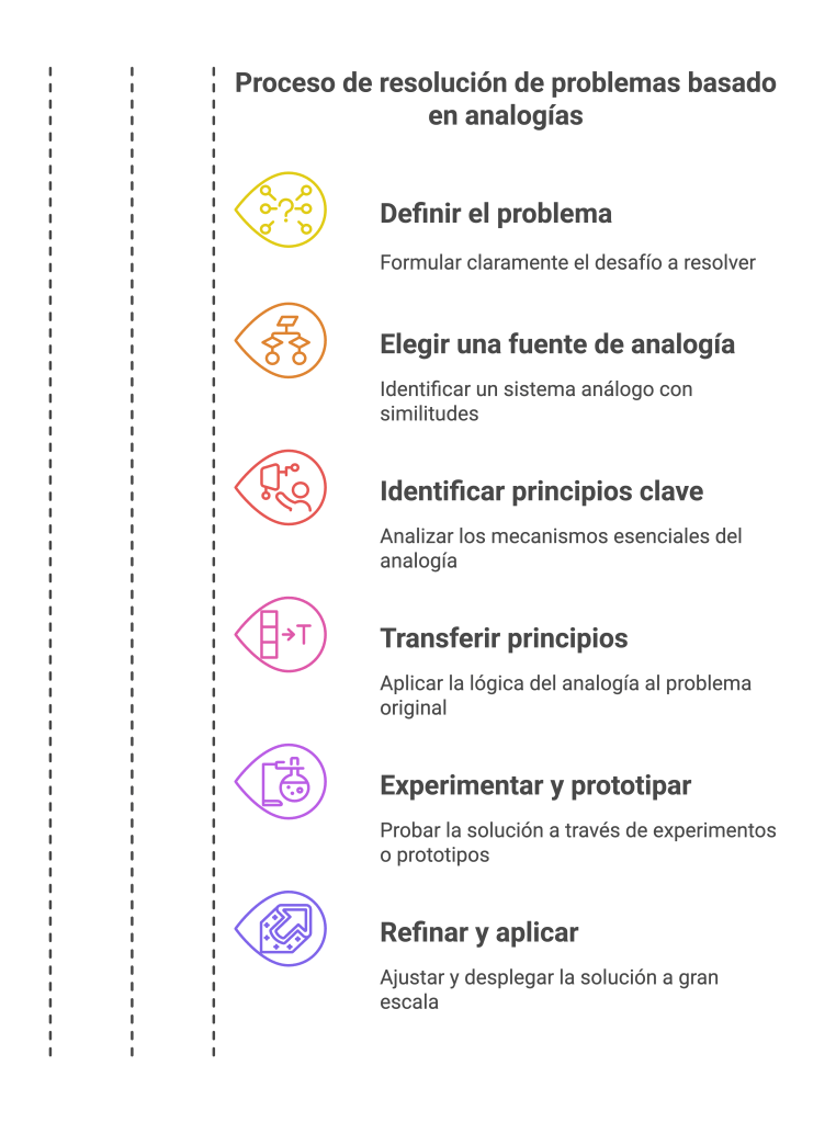 Según Holyoak y Thagard (1995), el pensamiento analógico sigue un proceso sistemático que permite trasladar conocimientos de un dominio a otro. Este proceso puede aplicarse en seis pasos: