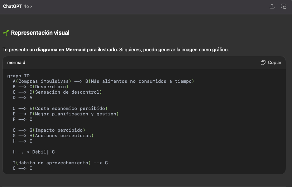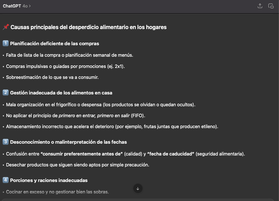 - Análisis en profundidad del problema: Explora las causas subyacentes del desperdicio alimentario. Lo hemos realizado con ChatGPT, te dejo aquí los resultados. Por motivos de extensión hemos realizado un análisis sencillo, pero te recomiendo que uses la función de DeepResearch.