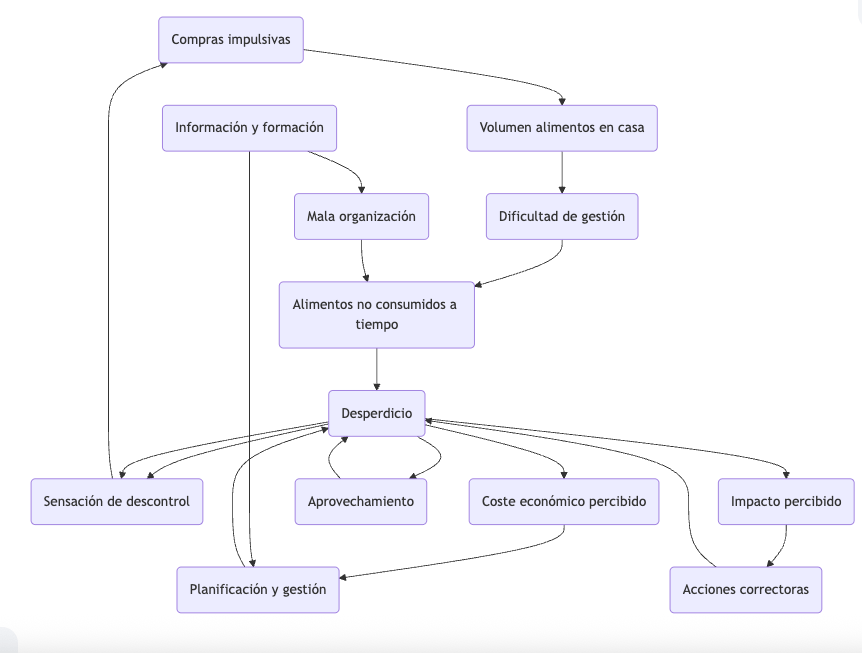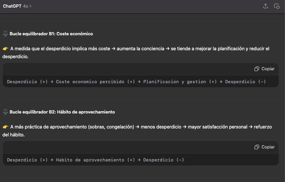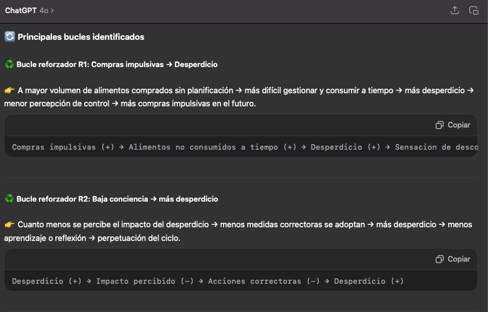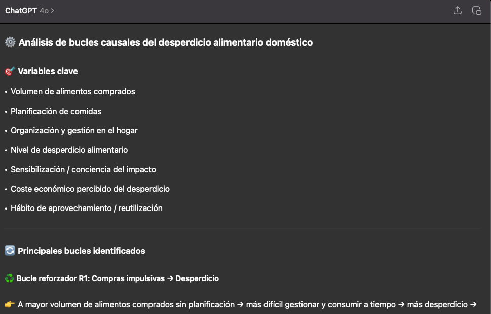 Para ilustrar cómo el pensamiento sistémico y la inteligencia artificial pueden combinarse de manera efectiva, vamos a compartir un ejemplo aplicado al caso del desperdicio alimentario en los hogares. Para ello, seguimos este esquema: