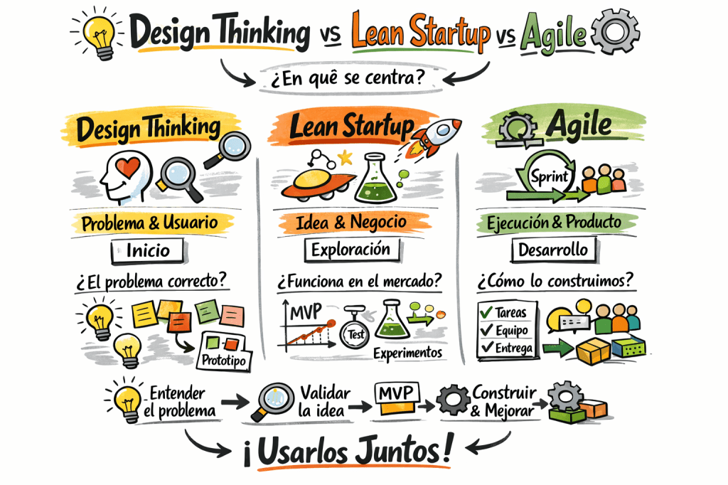 Agile no pretende decidir qué construir ni si hacerlo, sino cómo hacerlo bien en entornos cambiantes. Este matiz es clave, ya que Agile no sustituye a Lean Startup ni a Design Thinking, más bien asume que ciertas decisiones estratégicas ya han sido tomadas.