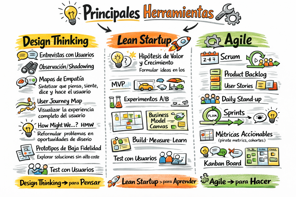 Lejos de ser metodologías alternativas, cada una aborda un tipo distinto de incertidumbre y responde a preguntas diferentes a lo largo del proceso. Vamos a profundizar un poco más en cada una de ellas, qué son, para qué sirven y sus herramientas principales.