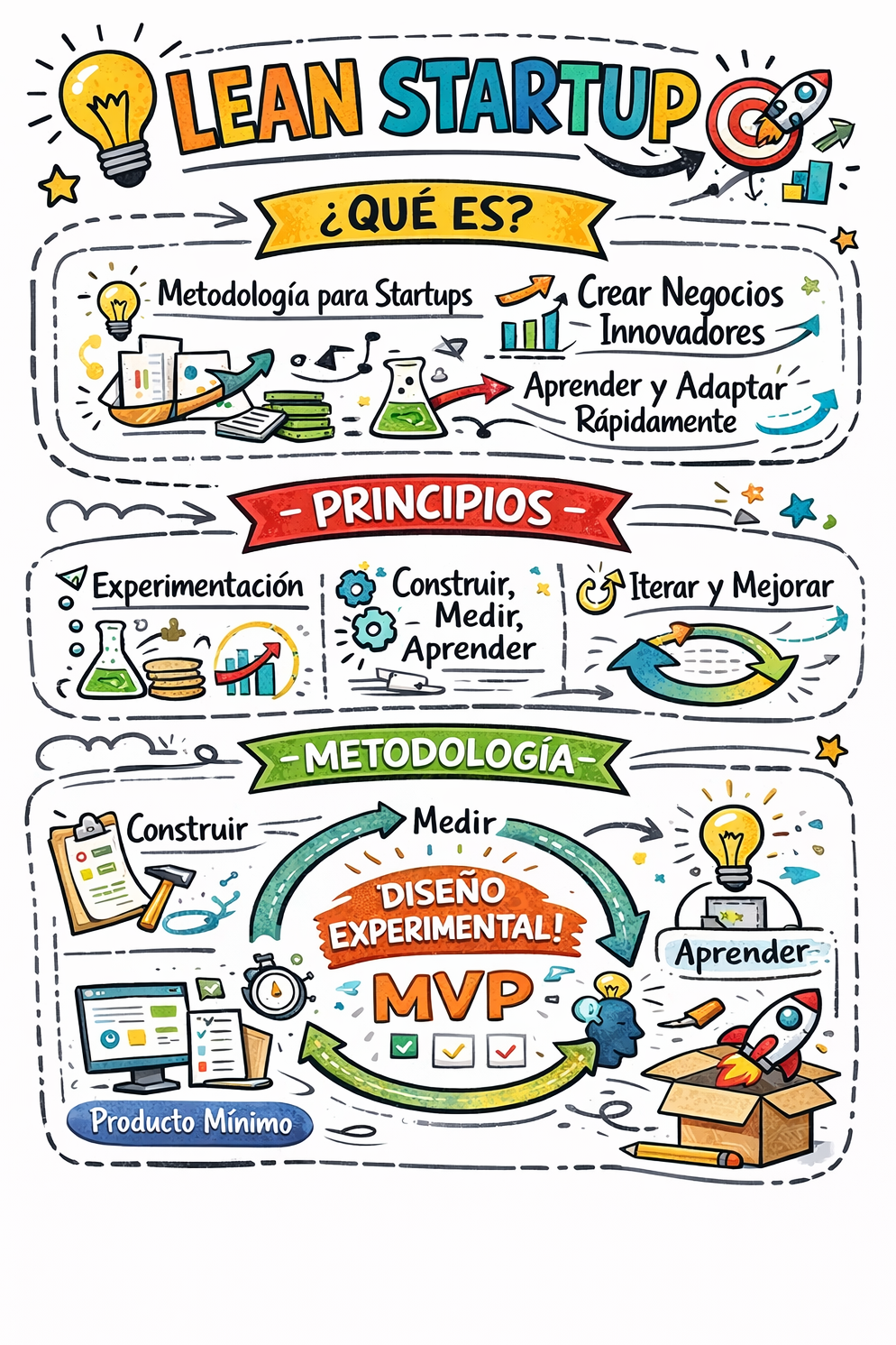 Una vez definido el problema, el siguiente riesgo es invertir recursos en una solución que no funcione. Aquí entra Lean Startup, formulado por Eric Ries (2011), cuyo núcleo es el concepto de aprendizaje validado. Frente a planes de negocio extensos, propone: